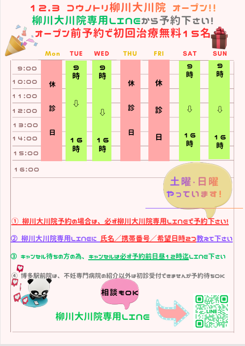 最も不妊体質改善効果のある治療コース「コウノトリ式子宝鍼灸治療法」+「遠赤外線療法+光線療法」+「コウノトリ式骨盤矯正法」の合計8,820円が→7,000円で1年間受診出来ます。1年間又は、1年以内にあなたに妊娠してもらうのが目的です。キャンペーン治療費は、平日は7,000円ですが、土曜日のみ7,500円になります。